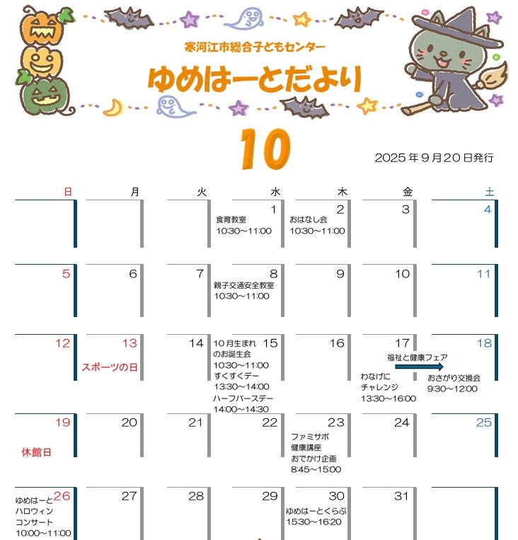 詳しくはこちらをご覧ください↓ ・イベント情報10月 ・10/18(土) おさがり交換会チラシ ・10/23(木) ファミサポ健康講座 お出かけ企画チラシ ・10/26(日) ハロウィンコンサートチラシ