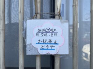 照子さんは、娘さんからの「やってみたら」をきっかけに、お抹茶の日を毎週開催している。朝7時から8時まで、茶室を開放。外には「お抹茶をどうぞ」とお手製の看板がかかっている。小学校で活動していることもあって、近所の子に「来れたらお茶を飲みにおいで」と声をかけているんだそう。石段を上り、「おはようございまーす」と扉をガラガラとあける。「はーい、どうぞー」と照子さんの優しい声が出迎えてくれる。