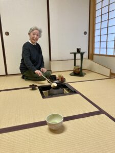 今は近所の小学校で茶道クラブの先生としても活躍している照子さん。一年の締めには、離れの茶室にて、先生や子ども達を招いて学びのお披露目会を行った。リボンで可愛らしく装飾されたメッセージカードは、何よりも嬉しく胸がいっぱいになった。子どもたちが「これは、夏の茶碗のかたちだ!」と、教えたことが知識になっていたこと目の当たりにし、嬉しさがこみあげた。そういうやりとりを通して、子ども達から元気をもらっている。