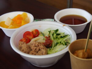 ふれあい食堂のメニューはサラダうどん、唐揚げ、フルーツヨーグルト。